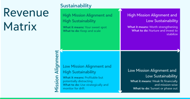 Low Mission Alignment / High Sustainability: This category often creates tension. These streams reliably bring in money—sometimes a significant amount—but they sit on the periphery of what your organization is truly about. Maybe it’s a legacy fundraiser that no longer connects to your story or a partnership that brings in funds each year but doesn’t quite advance your strategic priorities. These can be valuable tools, but they require vigilance. Teams should regularly ask whether the revenue is worth the tradeoffs, and if there’s a way to realign the stream, so it supports—not distracts from—your mission.
