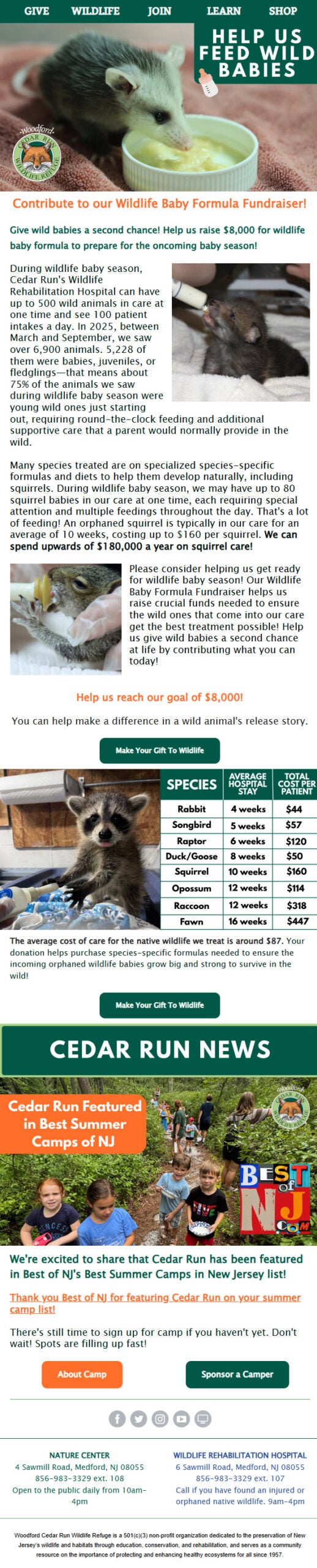 - Reach Out Regularly: Even if you don’t have a current campaign or specific fundraising drive underway, regularly reaching out to your supporters helps them stay engaged and informed. These regular communications can also help generate donations.Example: For every fundraising campaign email sent, Cedar Run Wildlife Center averages $330 and manages to capture an average donation of more than $114 by simply including a passive donation link in their general communications emails.