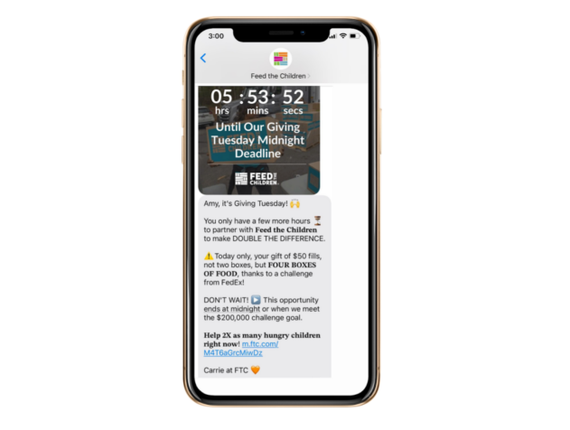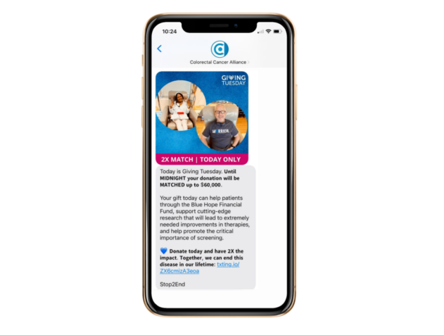 - Morning launch, ideally 9 a.m. to 11 a.m.: Use a compelling MMS to visualize impact, aid in storytelling, or share a timely opportunity such as a match. MMS fundraising texts typically drive 25% higher conversions than text-only SMS throughout the year, but on GivingTuesday that performance gap doubles, with MMS converting at roughly twice the rate of SMS.
